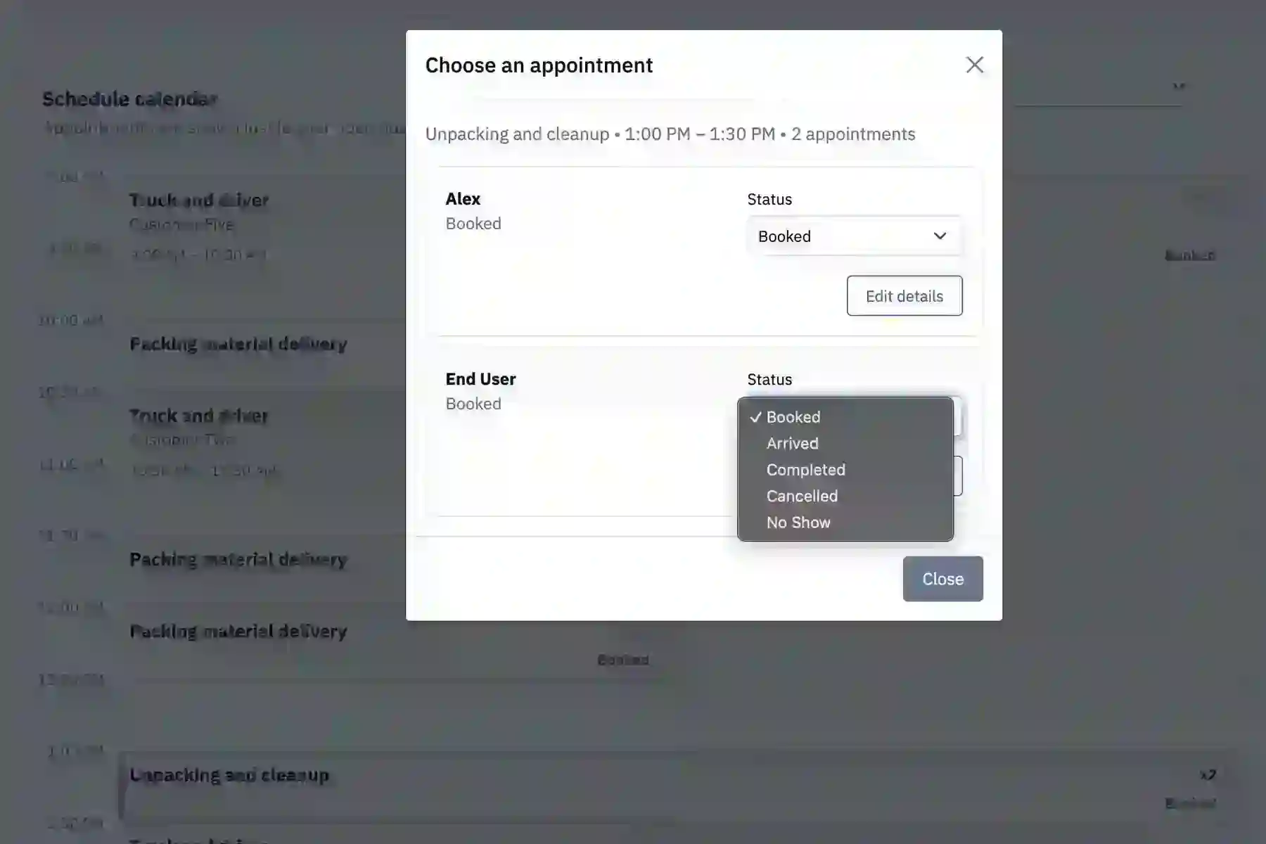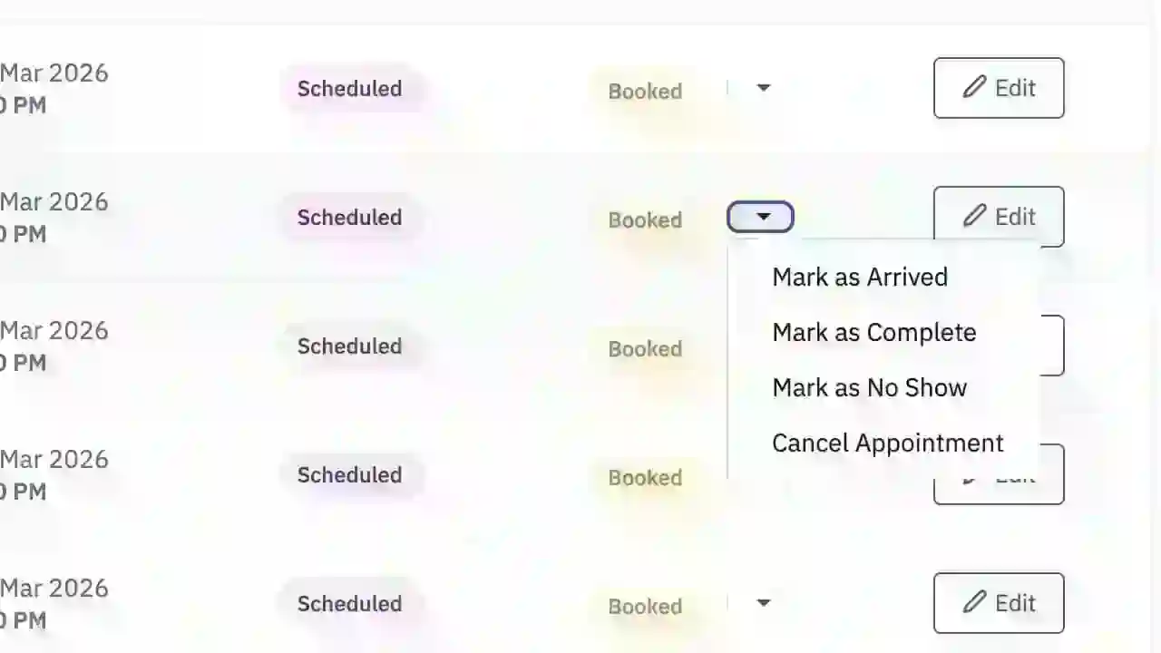 Move appointments through booked, arrived, complete, cancelled, and no show statuses.