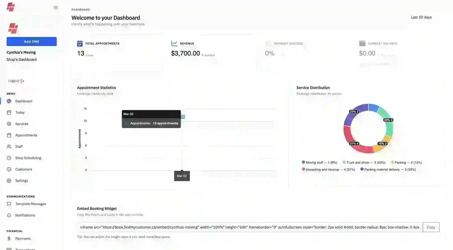 The Dashboard gives you a summary view of past appointment performance. Once your shop is active, this page helps you monitor volume, completed revenue, and service popularity. It works best after you are already using the workflows in Today, Appointments, and Services.