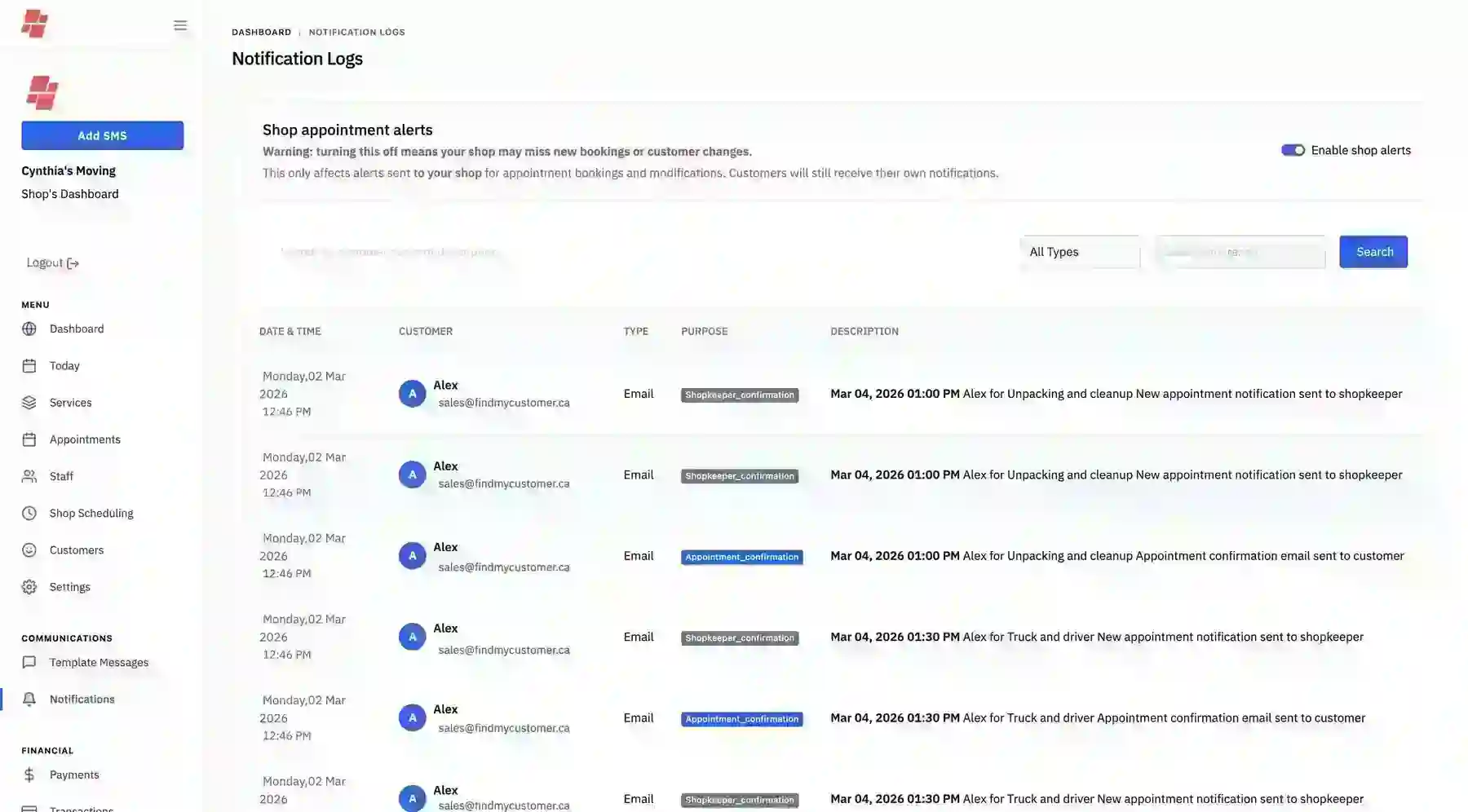Any time an email or text message is sent, it is logged here. This page helps you review what went out, how often notifications were sent, and whether shop alerts are enabled. It is especially useful when working with service reminders and template messages.