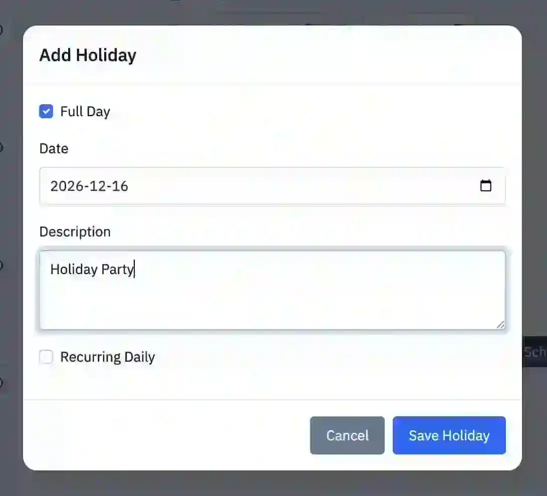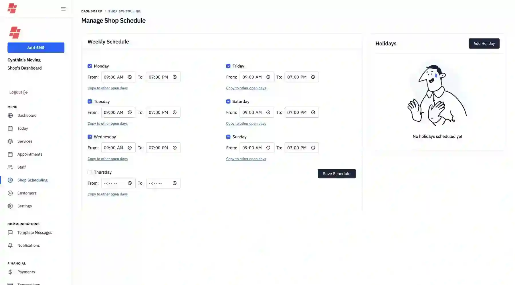 Shop Scheduling tells FMC when customers can and cannot book with you. Configure your working hours first, then layer on holidays and closures. Your scheduling settings work directly with service duration and buffers and with the planner on the Today page.