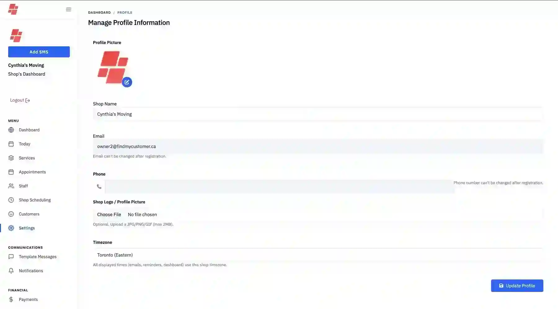 Start here before anything else. Your logo, timezone, address, password, and booking widget settings all live here. This is the first stop for a new business owner, and it supports the next steps in Shop Scheduling, Staff, and Services.