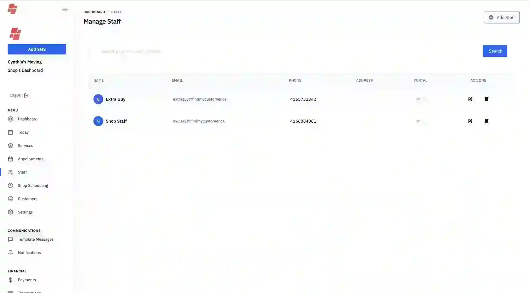 Staff members can be assigned to services and, when enabled, can access the shop portal.