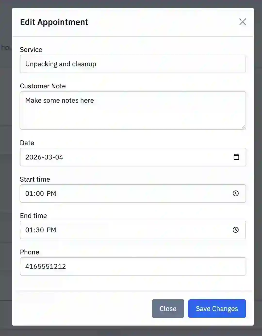The Appointments page shows your bookings in chronological order and gives you another place to review and update them. Use it alongside the Today page when you want a broader appointment list rather than a day-planner layout.