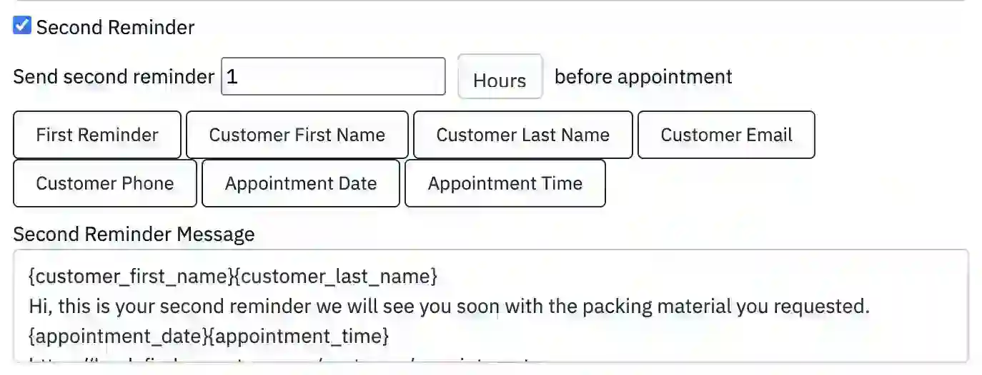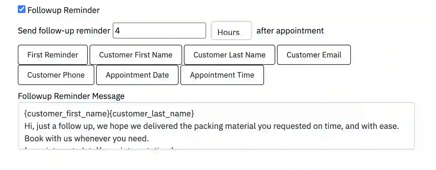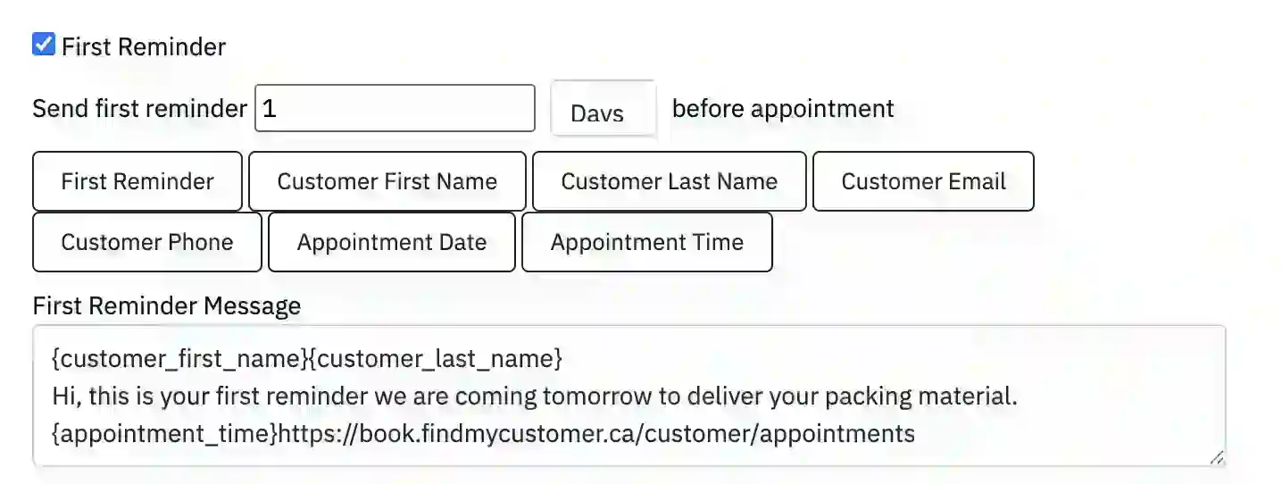 Write your message here and use the provided buttons to insert contextual appointment or customer data.