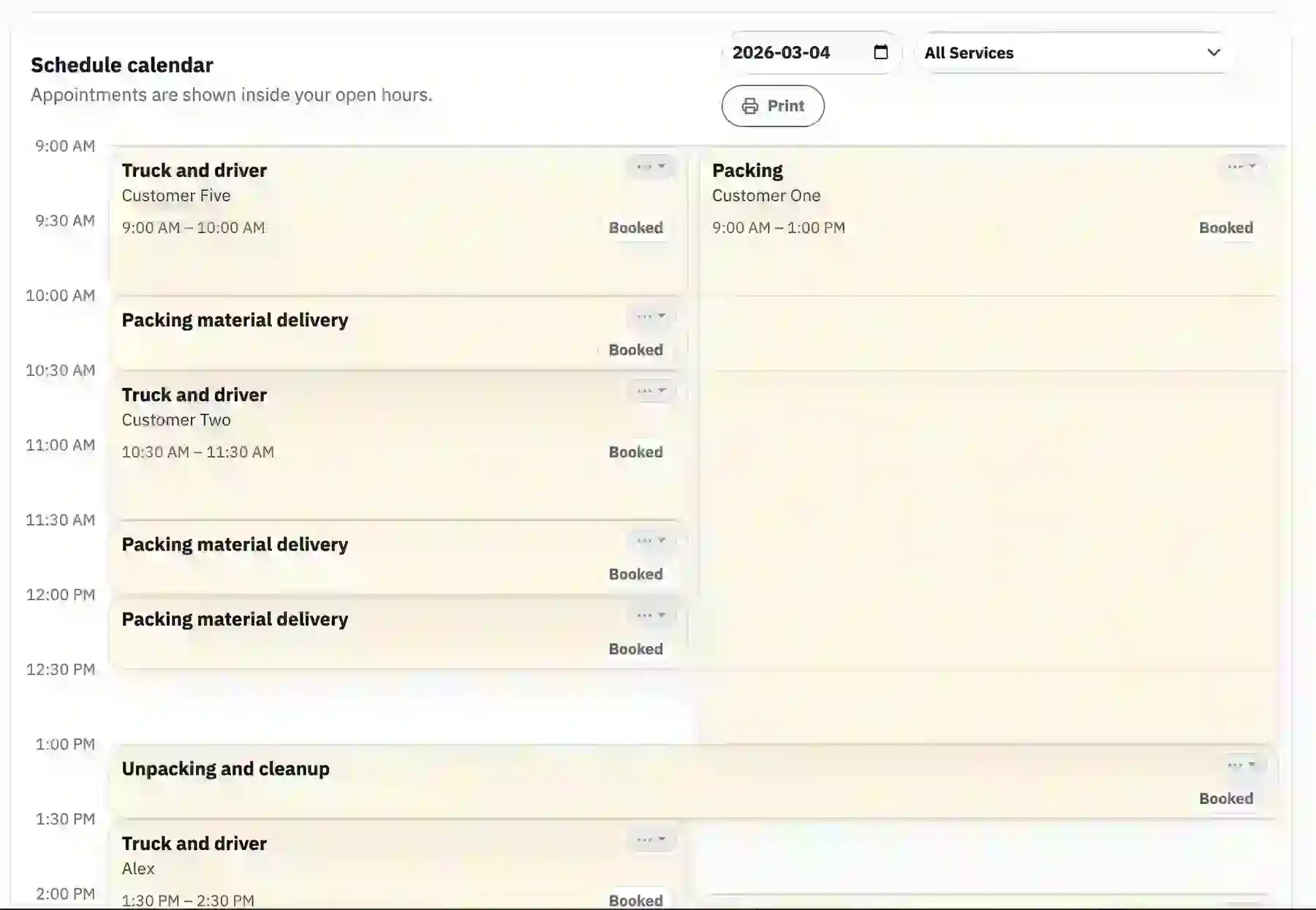 Once setup is complete, manage appointments, update statuses, and book quickly from one screen.